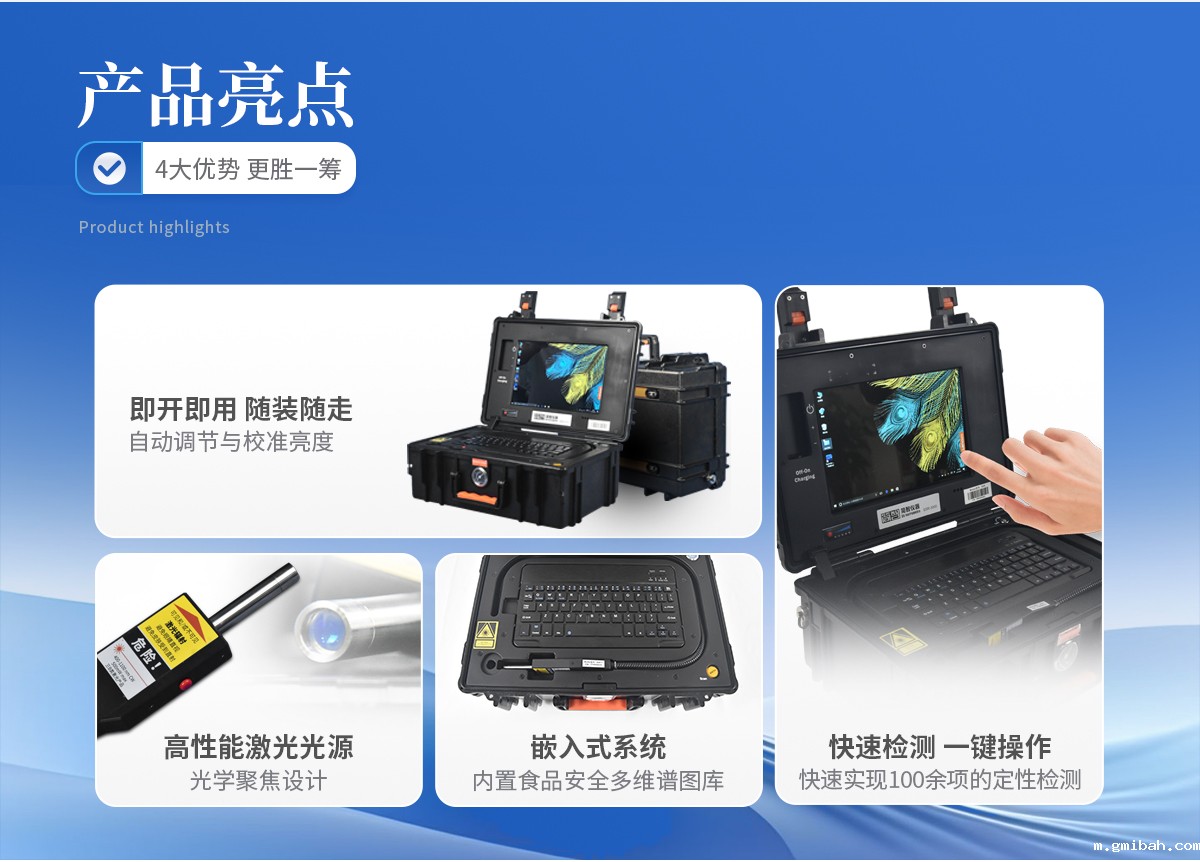 更专业 785nm光源:有效抑制荧光,适合便携式移动应用 超宽的光谱范围:检测物质种类更多 更高的信噪比:超强的微小信号探测能力 优质激光光源:数字可调高功率输出,窄线宽保障谱图质量 更便捷 光学聚焦设计:可以隔着塑料袋、玻璃瓶直接检测 快速自稳定光源:机器启动无预热时间,即开即用 超快检测速度:一秒出结果 便携式设计:独立可充电电源供电,随装随走,适合各种现场快检 更贴合应用 在线谱图库:提供各行业应用多维谱图库,支持在线升级 专业分析算法:智能解谱,自动匹配,多组分分析 行业应用软件:提供针对行业专用软件,支持客户订制