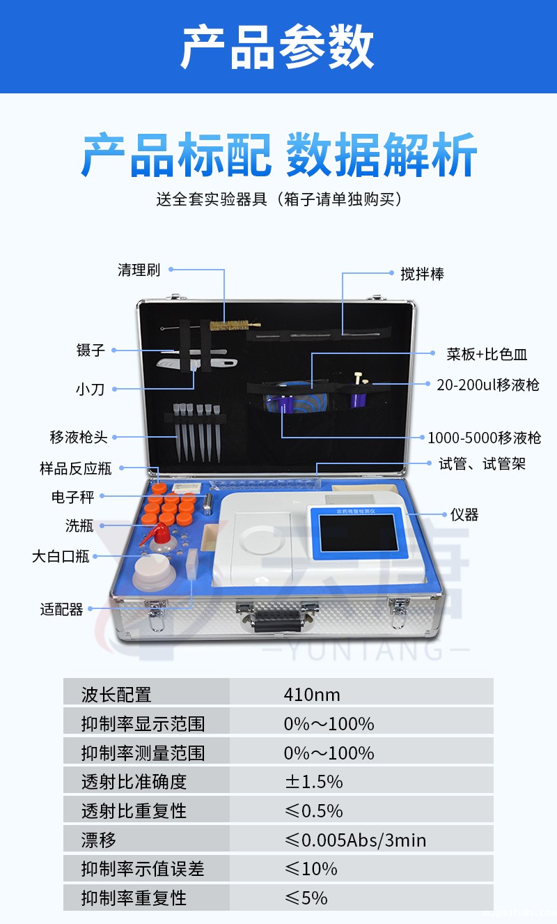 检测标准:依据国家标准方法(GB/T5009.199-2003)以及世界卫生组织WHO、世界粮农组织FAO残留农药检测标准、世界环境保护局EPA参照摄入量等要求来设计。采用酶抑制率比色法对水果、蔬菜等农林产品中有机磷和氨基甲酸酯类农药含量进行快速准确的检测,乙酰胆碱酯酶和丁酰胆碱酯酶试剂均可以使用,符合国家标准和农业部标准的要求。