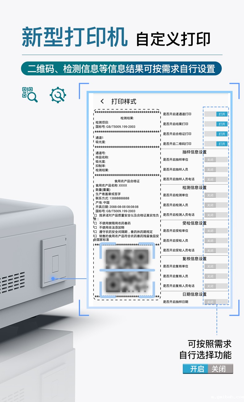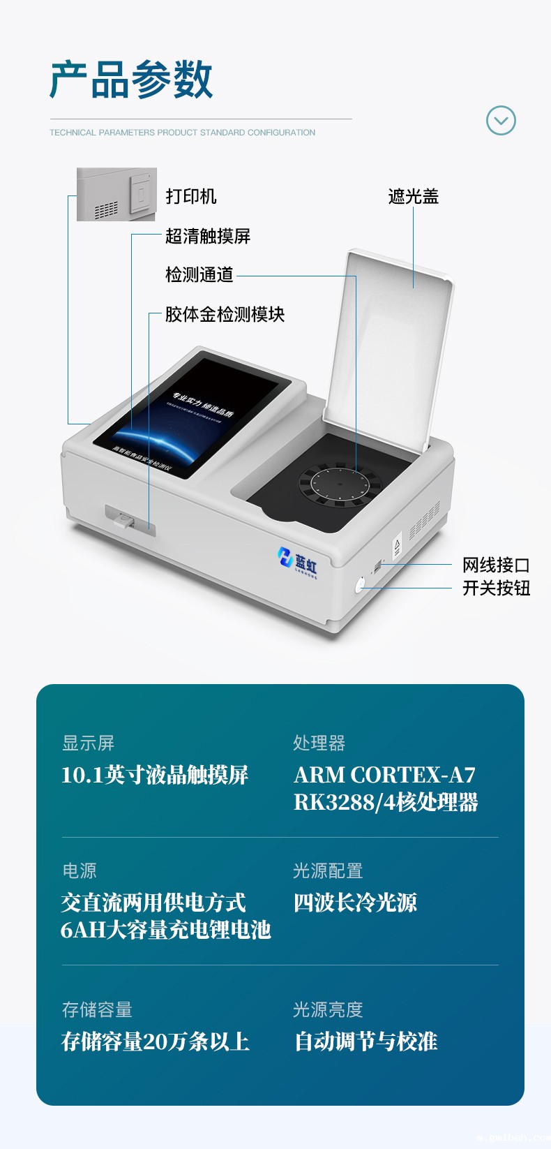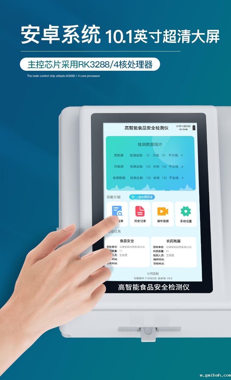 | 仪器采用手提式一体化系统检测技术,将分光光度模块、数字化管理模块、无线通讯模块高度集成于一体,支持检测200种食品安全检测项目,同时预留升级检测方法。 | 仪器检测模块标准化、智能化,检测项目可随意自由组合。检测箱体内置多个标准检测单元,检测模块可以调整配置。 | 显示屏幕:仪器采用10.1英寸竖向液晶触摸屏显,搭配运行安卓智能操作系统,主控芯片采用ARM Cortex-A7,RK3288/4核处理器,主频1.88Ghz,操作方便,性能更强。 | 检测通道:≥12通道;采用精密旋转比色池设计,使用同芯片同光源校准精度,解决不同光源之间的误差值,更加准确**。(1-12通道间误差0.1%,***:**202022821055.2) | 仪器光源:高精度进口四波长冷光源,每个通道均配置 410、520、590、630nm 波长光源,标配**的光路切换装置,专利光路切换功能可实现64波长,并且所有检测项目可实现所有通道同时检测。 | 设备可一键校准,自动保存校准数据,自动对比校验,得到精准光源,采用Android SP存储数据,光源数据永不丢失,方便每一次使用。 | 通讯接口:配备无线通信模块、可选配4G(APN)通讯模块和蓝牙传输,同时具有双USB接口以及RJ45网线接口,可以多方式实现数据保存及数据传输。 | 存储方式:支持U盘存储,标准USB接口,免驱动安装。检测结果存储容量20万条以上,可生成Excel表格进行拷贝,并具有登录保护功能。 | 智能化操作系统: | 1)操作系统:仪器可在同一检测界面自动对应相关检测通道,一次性选择1-12个样品名称,无需退出界面,节省操作时间。并可以对每个通道属性和样品信息单独进行编辑,例如送检单位、人员,检测人员等,打印时勾选打印显示。 | 2)数据集成系统:设备首页自动汇总分析检测数据,包含:周检测数据、月检测数据,全部检测总数量,均包含检测总数,合格数,不合格数,以及相关柱形分析图,各项检测数据一目了然,无需电脑查询,更加快捷直观。 | 3)数据库系统:十几项数据库分类管理仪器:包含项目类型、项目数据、检测数据、历史记录、国标信息、曲线信息、采样信息、检测信息、受检信息、复核信息、图表信息、光源校准信息、打印样式信息、样品库信息等等,数据库之间互相协调联动保证数据的真实完整性。同时产品数据库以及历史检测记录支持一键检索功能。 | 4)限量规判系统:具有限量查询、添加物质合规判定系统。检测出结果后,系统自动调用系统数据库中相关国标进行比对判定,客观显示判定结果是否合格。 | 5)项目预设系统:仪器具有任务预设模块,一键提前预设,给出方便快捷的新检测方案,每一个任务分别可以设置不同的样品、批次、编号、来源、备注、抽样信息、检测信息、受检信息、复核信息等更多信息。样品送检时一键调取保存信息,并可多次调取,大大提高检测效率。 | 6)数据监管系统:同步对接监管平台,数据可局域网和互联网数据上传,检测结果可选择直接传至食品安全监管平台。进行区域食品安全监管及大数据分析处理与数据统计,检测区域食品安全长短期动态,达到食品安全问题预估、预警。 | 7)打印系统:内置全新打印机,新创自定义打印方式,可按需灵活勾选控制:产品合格证(国家农业部标准要求),二维码,抽样信息、检测信息,受检信息、复核信息、抽样日期、检测日期等信息的打印。 | 供电模式:仪器交直流两用,直流12V供电,可连接车载电源,可配6ah大容量充电锂电池,电量可实时显示,方便户外流动测试。 | 仪器加入远程升级功能,可定向分客户分仪器更新,开机后自动更新,客户无需任何操作,即可升级全新项目。做到了无需退换机器即可实现实时远程升级检测仪器。 | 设备尺寸:(长*宽*高)440*300*180mm | 仪器加入远程升级功能,可定向分客户分仪器更新,开机后自动更新,客户无需任何操作,即可升级全新项目。做到了无需退换机器即可实现实时远程升级检测仪器。 |