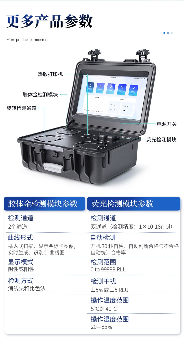 | 1. 功能构成:主要包括分光光度模块、新型农残检测模块、胶体金检测模块、荧光检测模块、数字化管理模块等,所有模块集成一体,可快速检测200多种食品安全项目,如兽药残留、农药残留、非法添加剂、细菌数值等指标。 | 2. 检测样品种类:餐具及厨房用品、瓜果蔬菜及其制品、水产品及其制品、畜禽产品及其制品、婴幼儿乳品及奶粉制品、蜂蜜、粮油及其制品、调味品(食醋、酱油、味精、盐等)、酒类茶叶及其制品、食用菌、饮料、蛋类药物残留(鸡蛋,鸭蛋等)、米豆面制品、糖果糕点类(小食品)、薯类及膨化食品、瓶(桶)装饮用水、添加食用色素的食品、使用添加剂的食品、含有有毒有害物质的相关食品。 | 3、显示屏幕:仪器采用15.6英寸液晶触摸屏显,搭配运行安卓智能操作系统,主控芯片采用ARM Cortex-A7,RK3288/4核处理器,主频1.88Ghz,操作方便,性能更强。 | 4、供电模式:仪器交直流两用,直流12V供电,可连接车载电源,配18ah大容量充电锂电池,电量可实时显示,无外部电源条件下可持续工作至少 4 小时。 | 5、检测通道:≥24通道;采用精密旋转比色池设计,使用同芯片同光源校准精度,解决不同光源之间的误差值,更加准确**,采用高精度进口四波长冷光源,每个通道均配置 410、520、590、630nm 波长光源,标配**的光路切换装置,专利光路切换功能可实现64波长,并且所有检测项目可实现所有通道同时检测. | 6、通讯接口:配备无线通信模块、4G(APN)通讯模块、蓝牙传输,同时具有双USB接口以及RJ45网线接口,可以多方式实现数据保存及数据传输。 | 7、存储方式:支持U盘存储,两个标准USB接口,免驱动安装。检测结果存储容量20万条以上,可生成Excel表格进行拷贝,并具有登录保护功能。 | 8、操作系统:仪器可在同一检测界面自动对应相关检测通道,一次性选择不少于11个样品名称,无需退出界面,节省操作时间。并可以对每个通道属性和样品信息单独进行编辑,例如送检单位、人员,检测人员等,打印时勾选打印显示。 | 9、数据集成系统:设备首页自动汇总分析检测数据,包含:周检测数据、月检测数据,全部检测总数量,包含检测总数,合格数,不合格数,以及相关柱形分析图,各项检测数据一目了然,无需电脑查询,更加快捷直观。 | 10、数据库系统:十几项数据库分类管理仪器:包含项目类型、项目数据、检测数据、历史记录、国标信息、曲线信息、采样信息、检测信息、受检信息、复核信息、图表信息、光源校准信息、打印样式信息、样品库信息等等,数据库之间互相协调联动保证数据的真实完整性。同时产品数据库以及历史检测记录支持一键检索功能。 | 11、限量规判系统:具有限量查询、添加物质合规判定系统。检测出结果后,系统自动调用系统数据库中相关国标进行比对判定,客观显示判定结果是否合格。 | 12、项目预设系统:仪器具有任务预设模块,一键提前预设,给出方便快捷的新检测方案,每一个任务分别可以设置不同的样品、批次、编号、来源、备注、抽样信息、检测信息、受检信息、复核信息等更多信息。样品送检时一键调取保存信息,并可多次调取,适用于大批量检测业务,可以大大提高检测效率。 | 13、数据监管系统:同步对接监管平台,数据可局域网和互联网数据上传,检测结果可直接传至食品安全监管平台。进行区域食品安全监管及大数据分析处理与数据统计,监测区域食品安全长短期动态及问题预估、预警。 | 14.1、全新打印系统:内置全新打印机,新创自定义打印方式,可按需灵活勾选控制:产品合格证(国家农业部标准要求),二维码,抽样信息、检测信息,受检信息、复核信息、抽样日期、检测日期等信息的打印。 | 14.2、A4纸版本报告打印功能:设备拥有两种结果展示方式,可以自动生成A4打印模板和小票打印模板两种样式,可通过WiFi及网线等方式连接外置打印机可进行打印。 | 15、胶体金检测模块:采用单通道CMOS成像处理技术及胶体金免疫层析技术,可读取胶体金卡数据,自动采集、处理分析,将检测结果显示,并可根据参考限值自动判断检测结果,可检测常见的兽药残留、生物毒素、抗生素、违禁添加物等。 | 15.1、可即时检测单联卡及三联卡; | 15.2、检测通道:2个通道; | 15.3、检测方式:消线法和比色法; | 15.4、显示模式:阴性或阳性; | 15.5、曲线形式:插入式扫描方式,显示金标卡图像,实时生成、识别CT曲线图,无需手动调整。兼容市场上其他金标卡,使用耗材不受限制。 | 16、荧光检测模块:快速检测水质中微生物、固体物细菌含量。利用“荧光素酶—荧光素体系”快速检测三磷酸腺苷(ATP)。以ATP含量表明样品中微生物与其他生物残余得多少,用于判断卫生状况。 适用于食品、餐具、手、液体等表面及水质洁净度的检测。 | 16.1、检测通道:双通道 检测精度:********** | 16.2、检测范围:0 to 99999 RLU | 16.3、检测时间:15 秒 | 16.4、检测干扰:±5﹪或±5 RLU | 16.5、操作温度范围:5℃到 40℃ | 16.6、操作湿度范围:20—85﹪ | 16.7、开机 30 秒自检、内置自校光源、自动判断合格与不合格、自动统计合格率 。 | 17、仪器具备远程升级功能,可定向分客户分仪器更新,开机后自动更新,并可持续性免费更新系统版本,无需像传统产品返厂更新,节省时间及人力成本并避免了物流运输返厂升级导致设备损坏的潜在风险。 |
