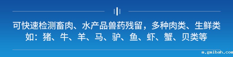 | 瘦肉精激素:盐酸克伦特罗、沙丁胺醇、莱克多巴胺、己烯雌酚等 | 抗生素残留:四环素类、硝基呋喃类、磺胺类、β-兴奋剂类、沙星类、磺胺类、喹诺酮类,甲砜霉素,氟苯尼考,金刚烷胺、替米考星、庆大霉素、林可霉素、链霉素、恩诺沙星、环丙沙星、头孢啦啶、青霉素、阿莫西林等 | 水产品安全类:孔雀石绿、氯霉素、呋喃妥因、呋喃西林、呋喃它酮、呋喃唑酮等 | 蛋类药物残留:氯霉素,四环素,磺胺类,喹诺酮类,呋喃西林,呋喃它酮,呋喃妥因,呋喃唑酮,氟苯尼考,阿莫西林、头孢氨苄、红霉素、链霉素等 | 动物疫病类:禽流感、新城疫、牛羊口蹄疫、牛羊结核病、牛羊包虫、牛羊布病、小反刍兽、猪蓝耳病毒、猪瘟病毒、猪伪狂犬病毒、猪细小、猪圆环、犬细小病毒、犬瘟热病毒、犬狂犬病毒等 | 真菌毒素残留:食用油、粮食及饲料中黄曲霉毒素B1、黄曲霉毒素总量,奶中黄曲霉毒素M1、呕吐毒素、玉米赤霉烯酮、赭曲霉毒素A、T2毒素、伏马毒素等 |