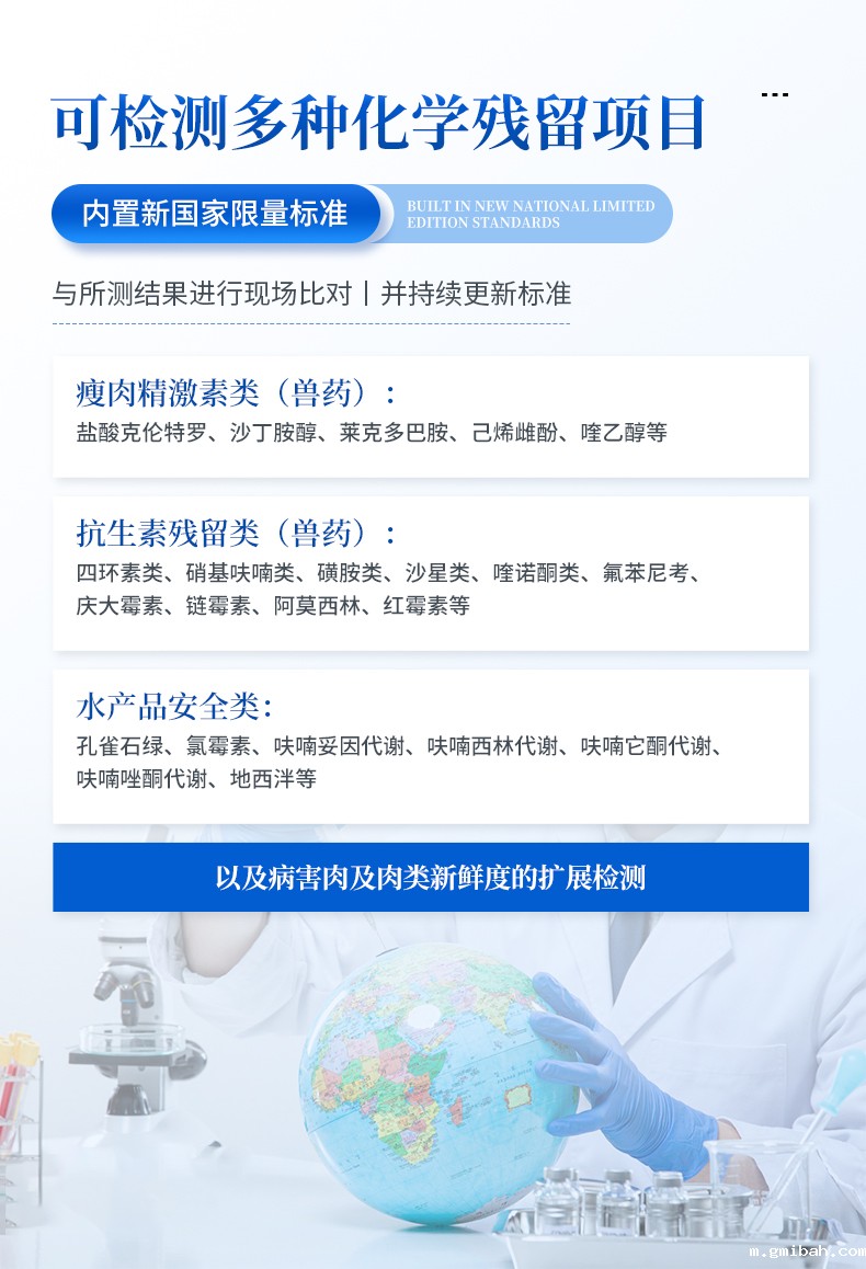 应用范围兽药残留检测仪可现场快速检测盐酸克伦特罗、莱克多巴胺、沙丁胺醇、恩诺沙星、氯霉素、链霉素、三聚氰胺、庆大霉素、磺胺类、喹喏酮类、呋喃类、四环素类、阿莫西林、孔雀石绿、黄曲霉毒素(B1,B2,G1,G2,M1,M2 )、疾病诊断、环丙沙星、红霉素、土霉素、喹乙醇、已烯雌酚等。
