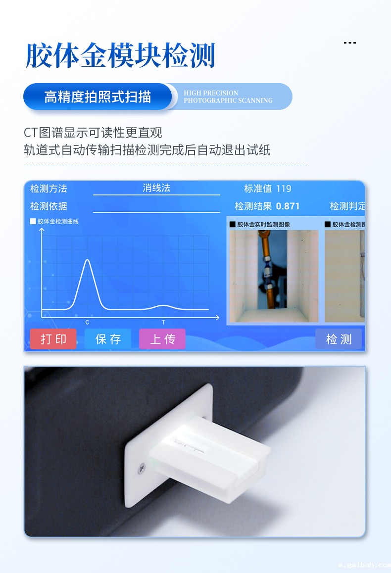 7、胶体金模块检测方式:轨道式自动传输扫描,检测完成后自动退出检测卡。