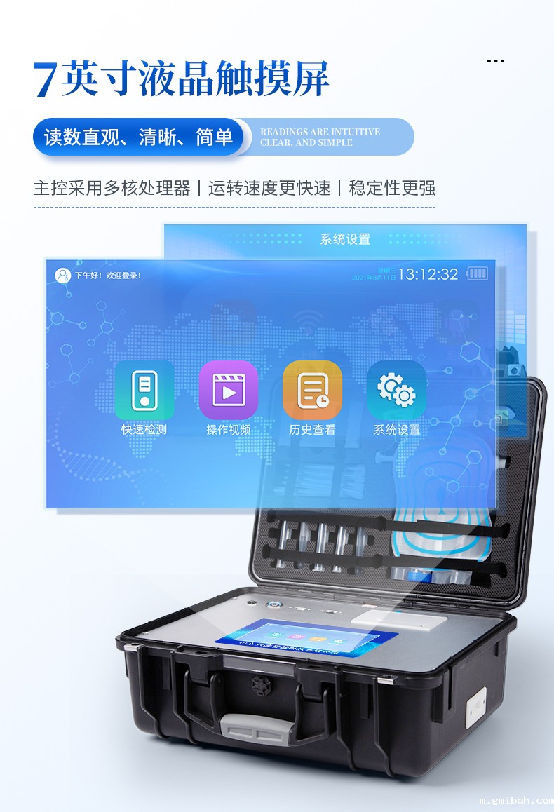 2、显示方式:7英寸液晶触摸屏显示,人性化中文操作界面,读数直观、简单。