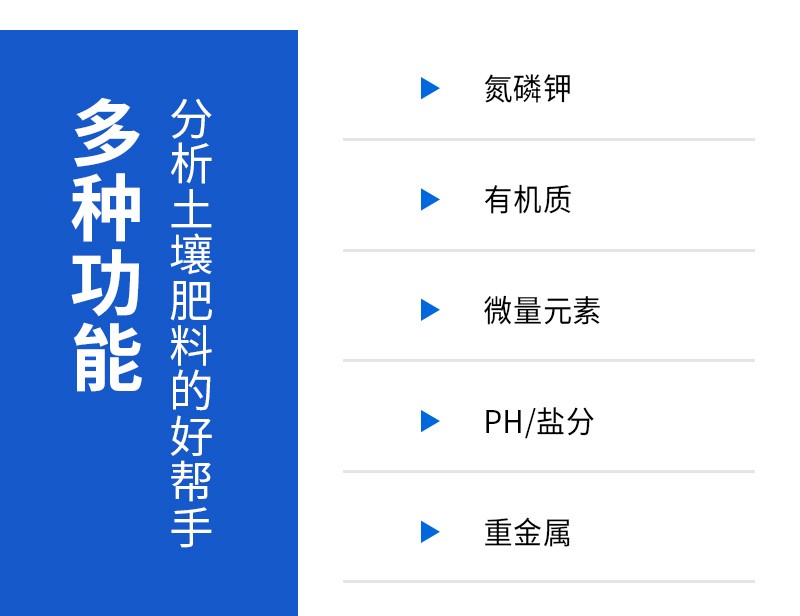 4、可检测土壤及化肥、有机肥、植株中的速效氮、有效磷、速效钾、全氮、全磷、全钾、有机质含量,土壤酸碱度,含盐量,以及土壤钙、镁、硫、硼、氯、硅等6种中微量元素。